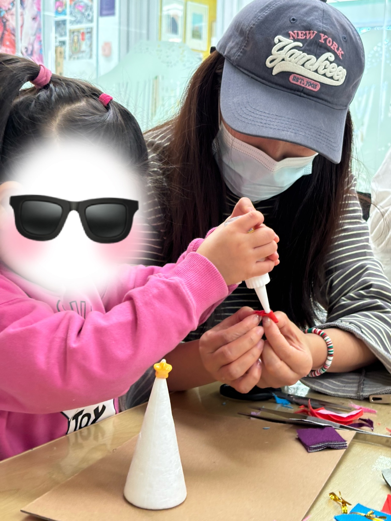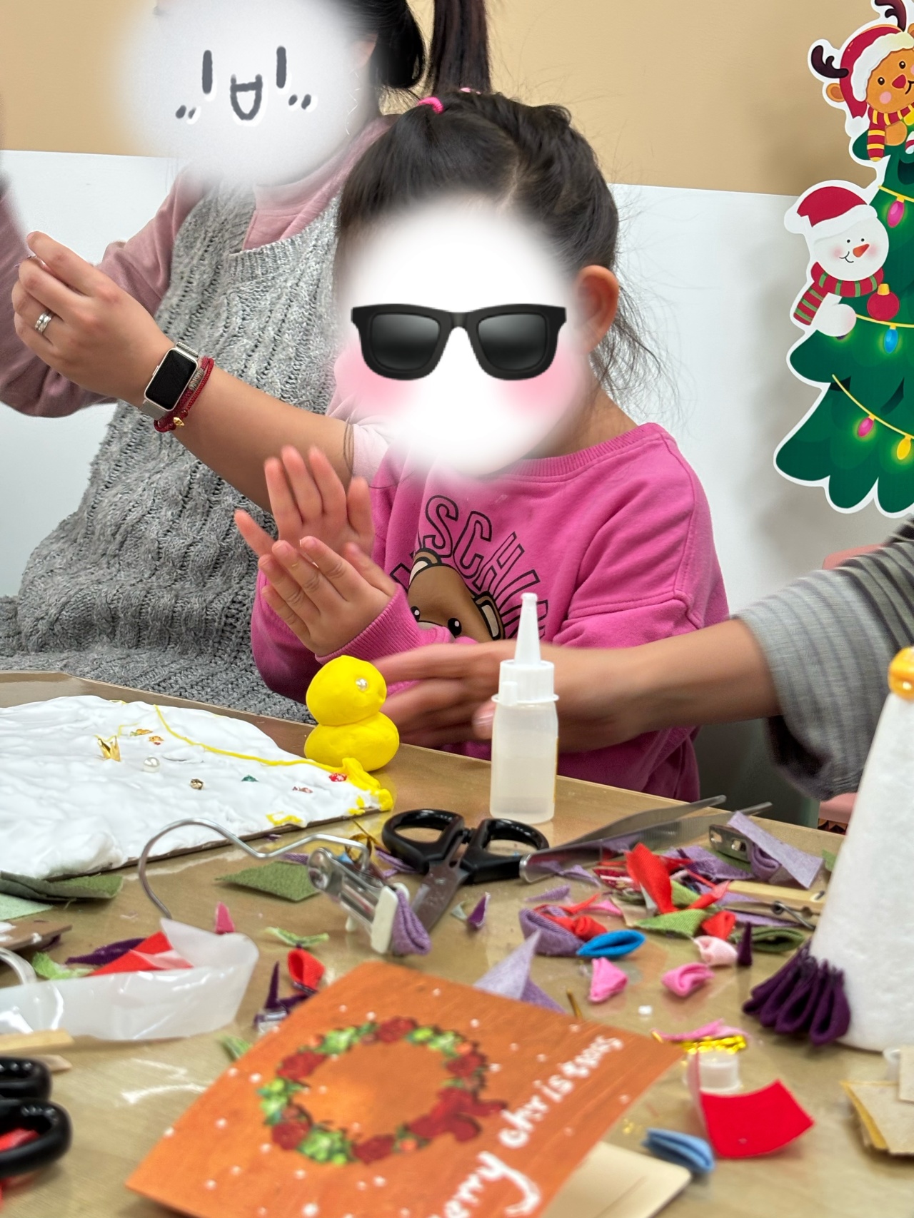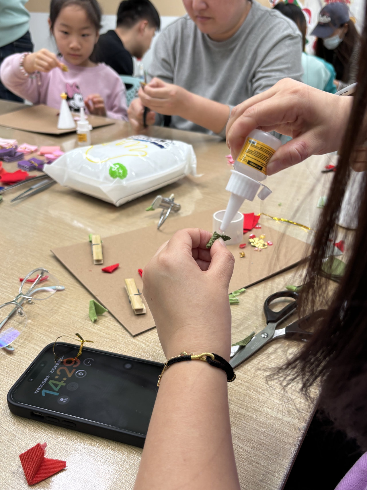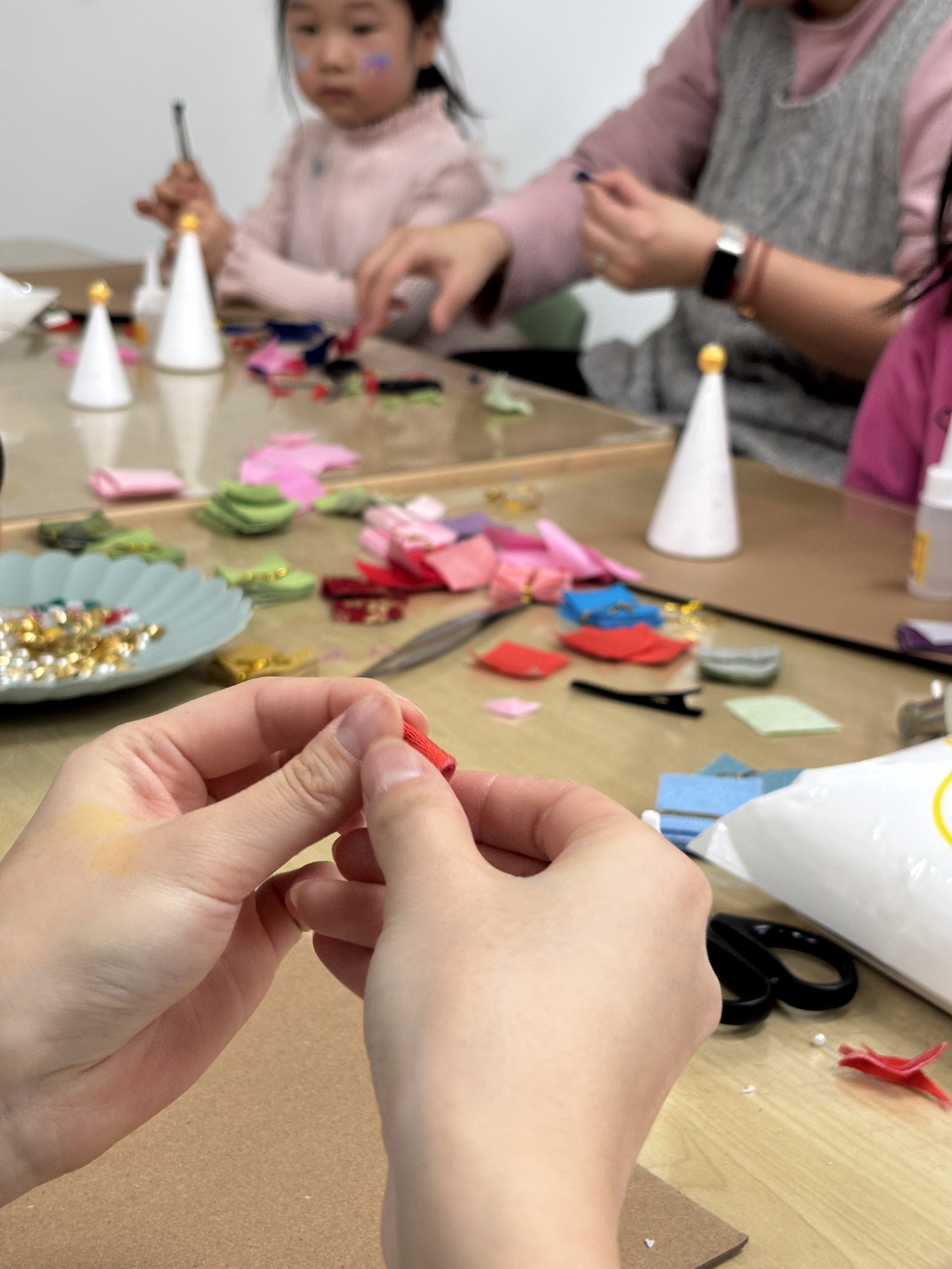 在细工花制作区,孩子们迎来了新的挑战——用细工花材料制作迷你圣诞树。看似简单的布,在孩子们的巧手下逐渐绽放出不一样的美丽。折叠、裁剪、粘贴……每一步都需要耐心与细心。当一株株精致的小圣诞树在手中“生长”出来时,孩子们的脸上洋溢着满满的成就感。这些独一无二的圣诞树,将成为他们家中最特别的节日装饰。