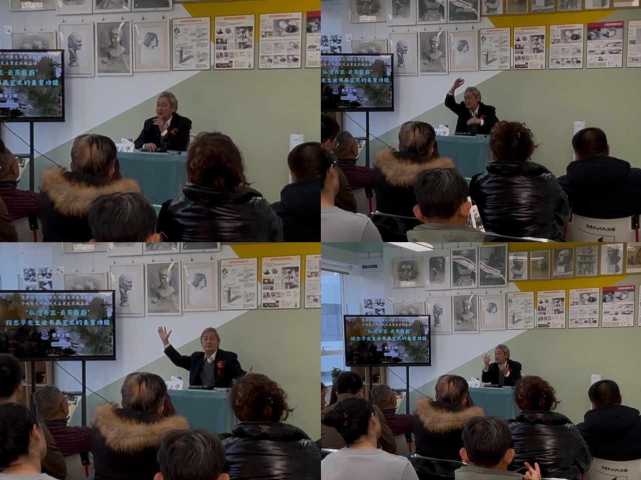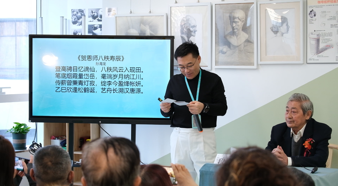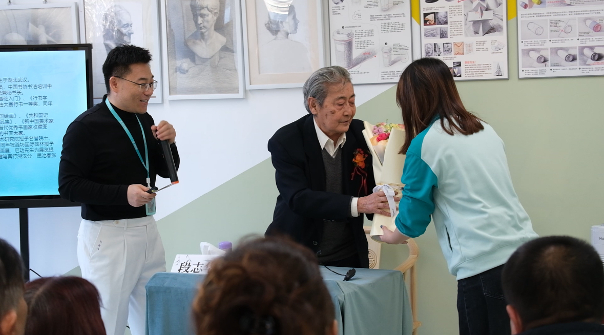活动核心 “弘道养正”大师讲座 在二、三画室举行。主持人龙校长首先系统介绍了段志华先生卓越的艺术生平与成就。随后,龙美翼艺术空间校区主管秦老师向段老敬献鲜花与祝福,共贺先生八秩华诞,场面庄重而感人。段老随后以 “书画艺术的美育功能” 为主题,结合自身八十载艺术人生,深刻阐述了书画如何滋养心灵、提升境界。先生话语平和深邃,字字珠玑,将“以艺养心,以美化人”的真谛,播撒在每个人心中。段老在讲座中提到“太极是中国传统美学的核心,看画作时不看细节,先看看局部是否有对比,整体是否有对比,整体的阴阳关系怎么样。实际上,艺术与科技是相通的,艺术与科技都要求有很高的想象力。艺术激发想象力,科技更需要艺术这样的想象力才可以提升科技的发展。